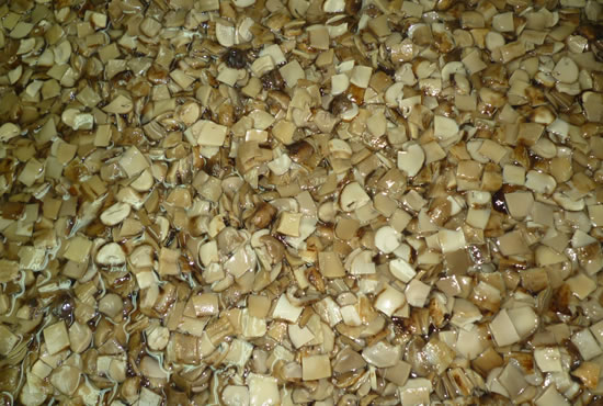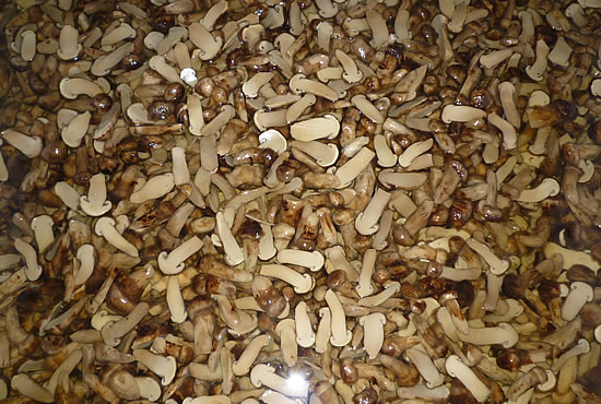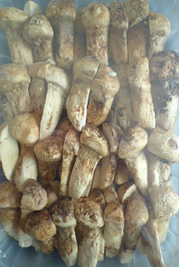 生松茸として流通させるのが困難、または運賃が割高であるなどした産地が主産地となる塩漬松茸が原料。