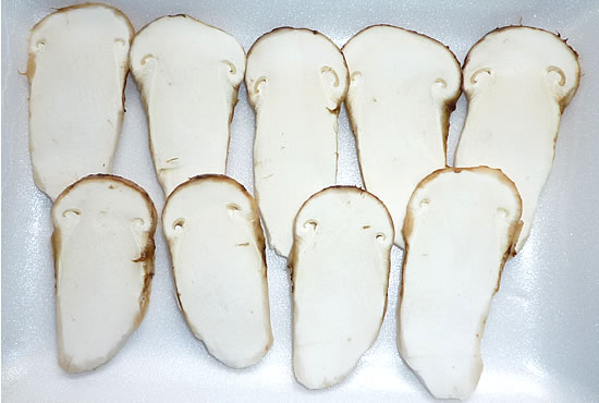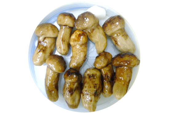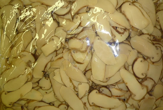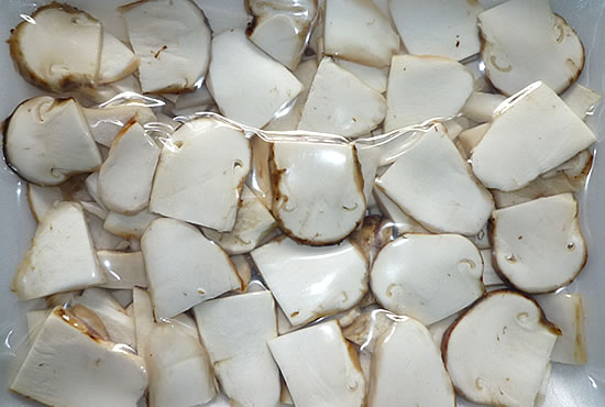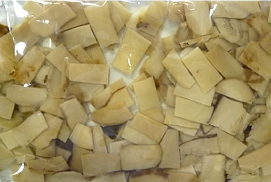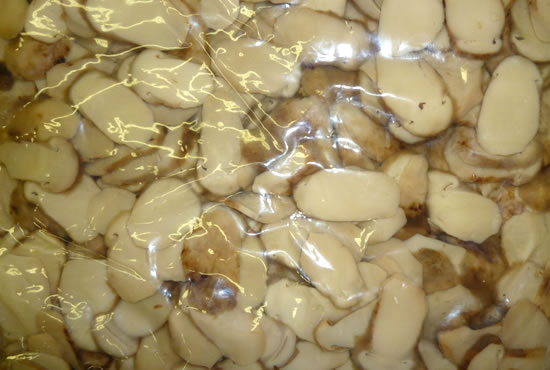 塩漬松茸を脱塩、スライスなどの加工を経た上で、クエン酸を添加し、真空パック若しくは缶詰に加工したものを言います。